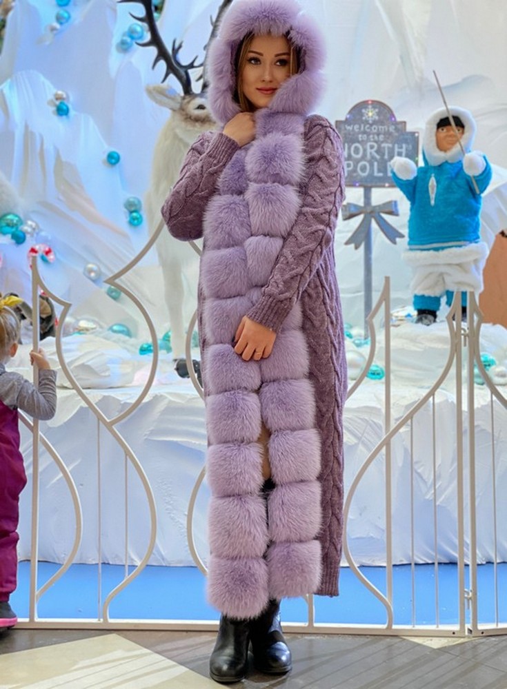 Кардиган с отделкой из меха аукционного финского песца .Возможно изготовление с капюшоном либо без капюшона. Качество на высшем уровне. Состав: 50% -шерсть, 50%- акрил.