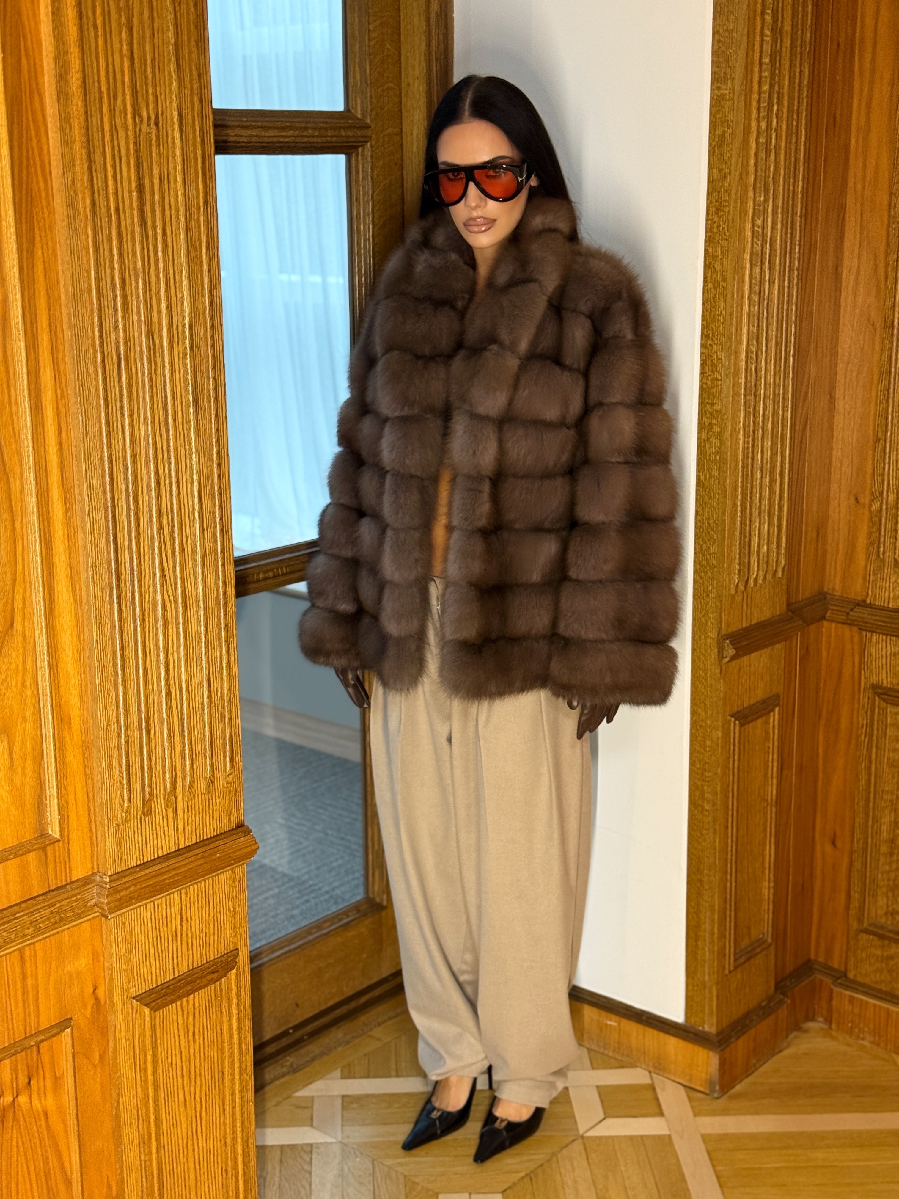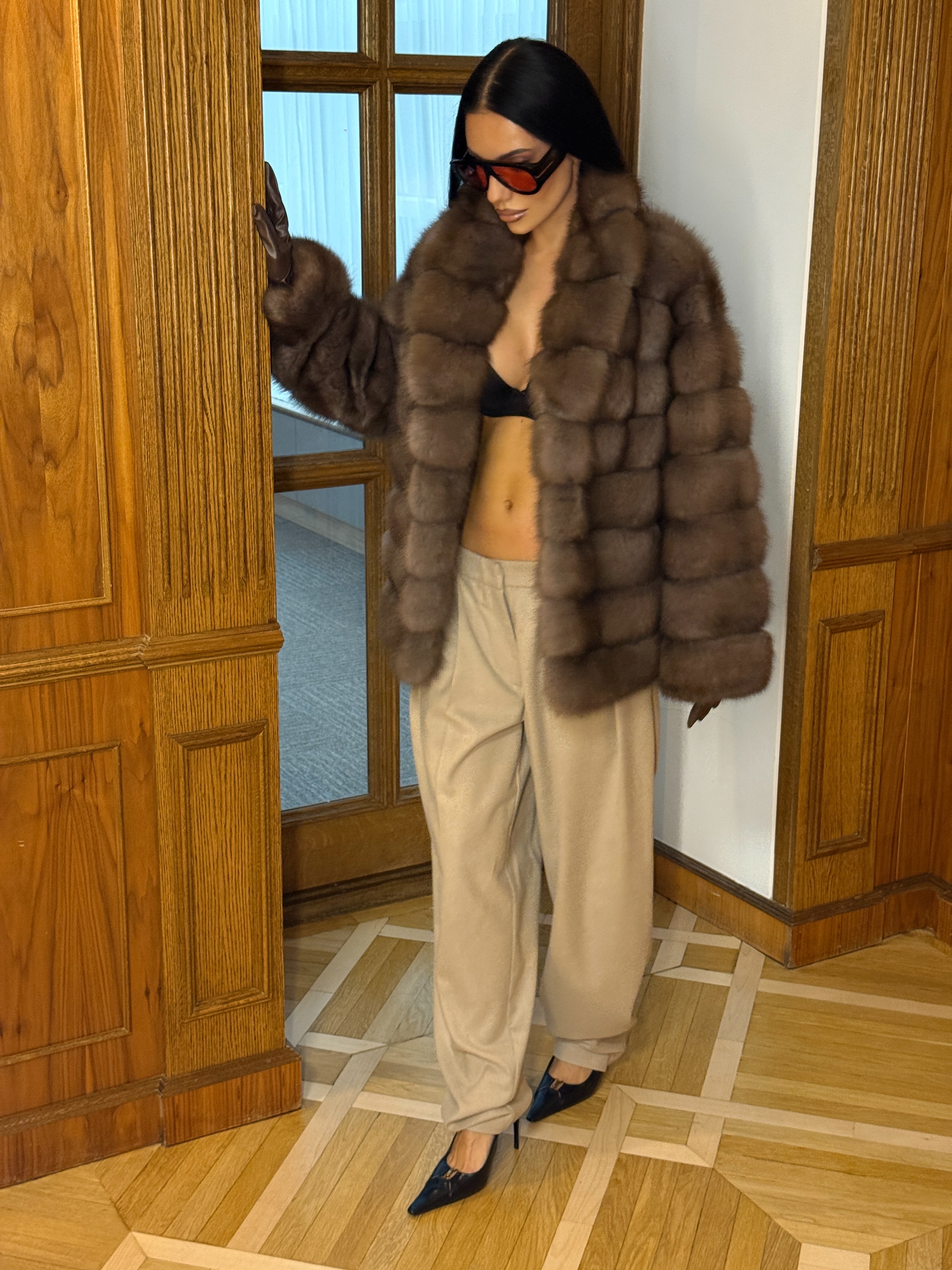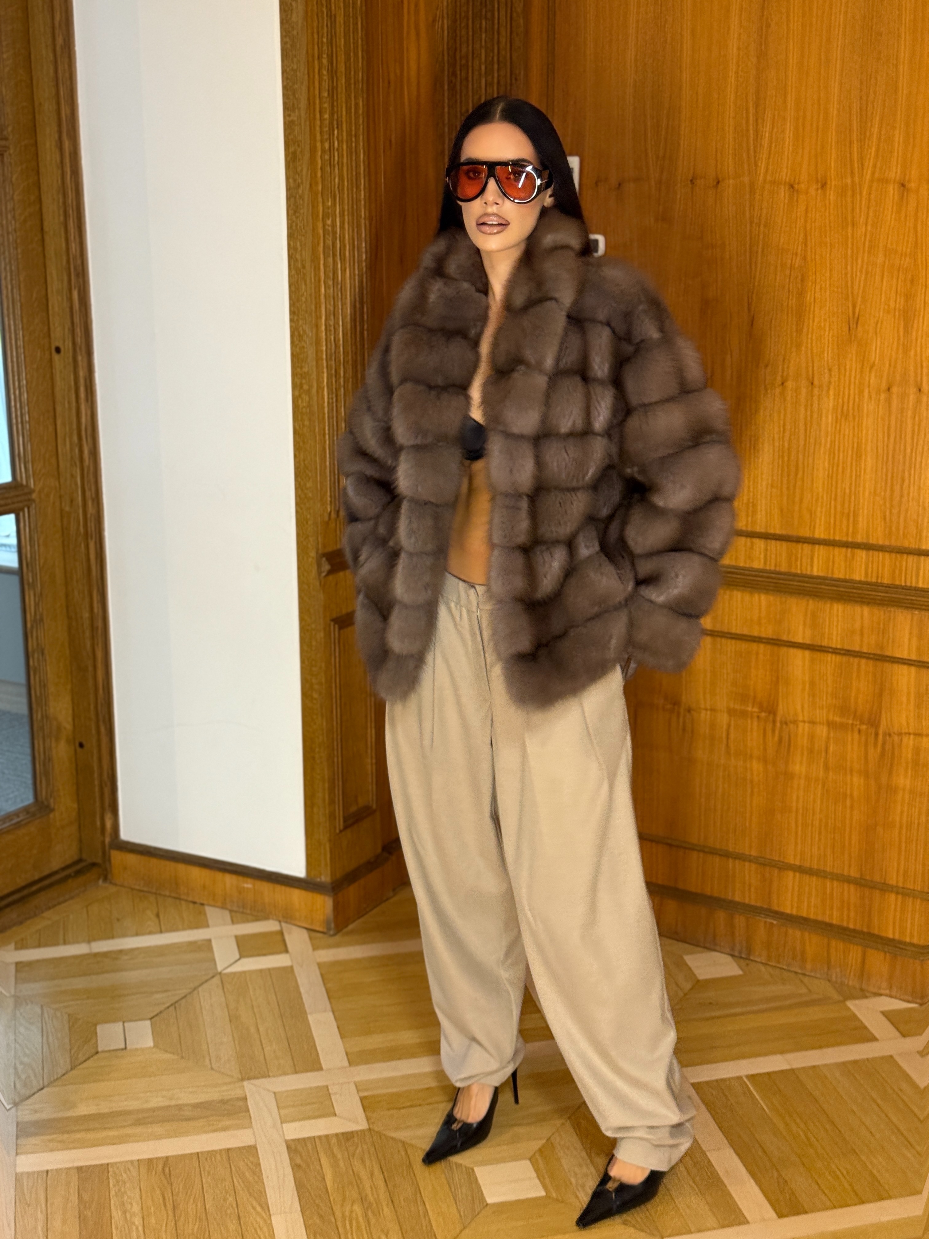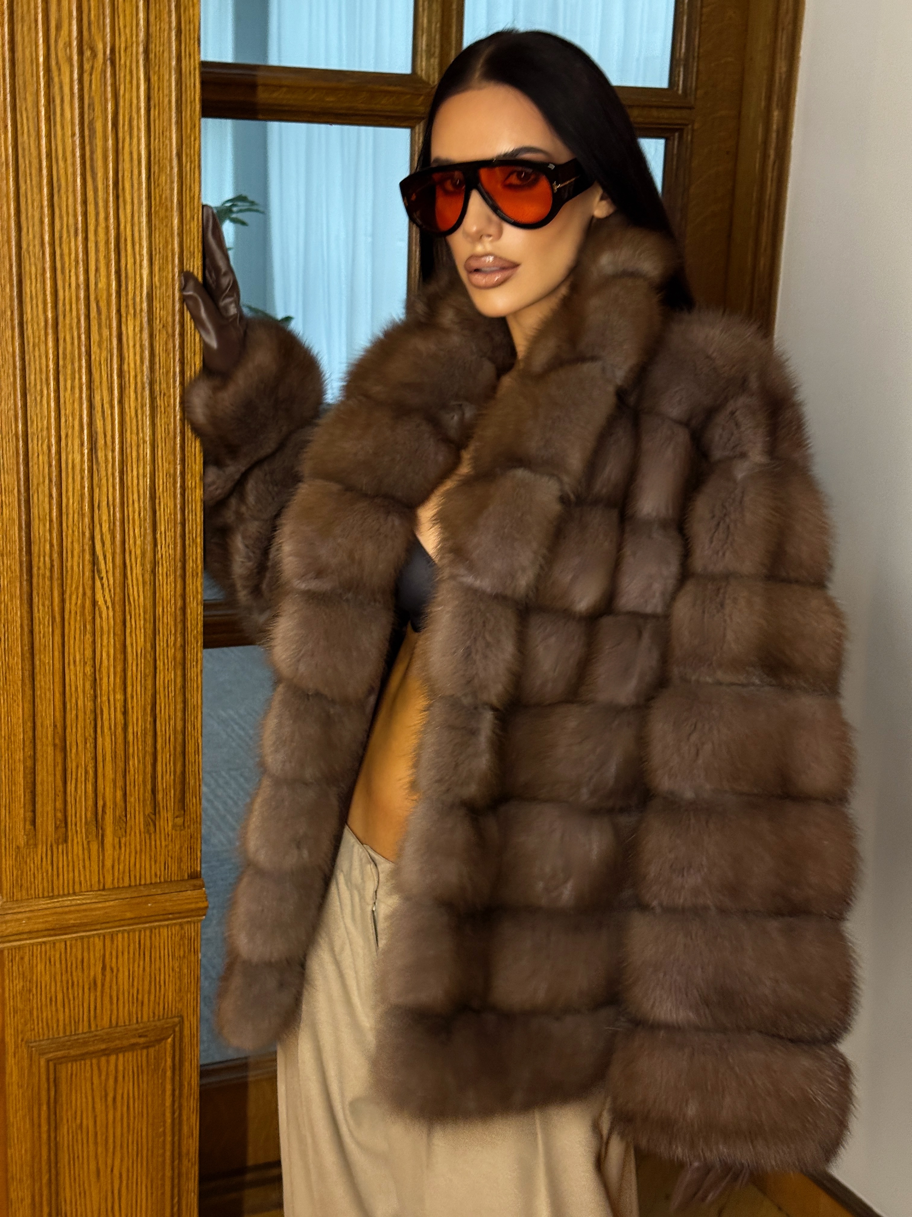 Шуба из меха куницы тонировка под соболя воротник шаль