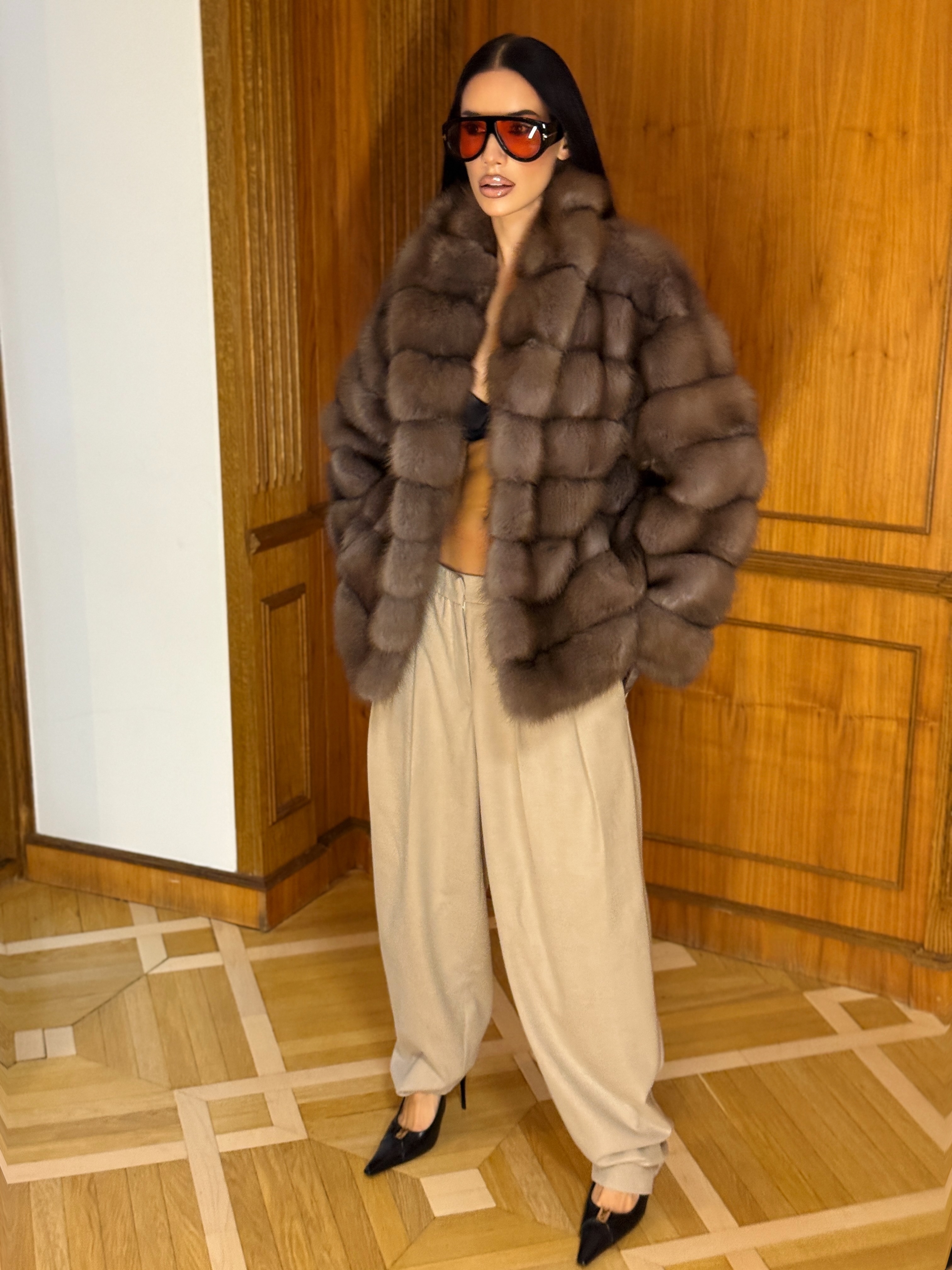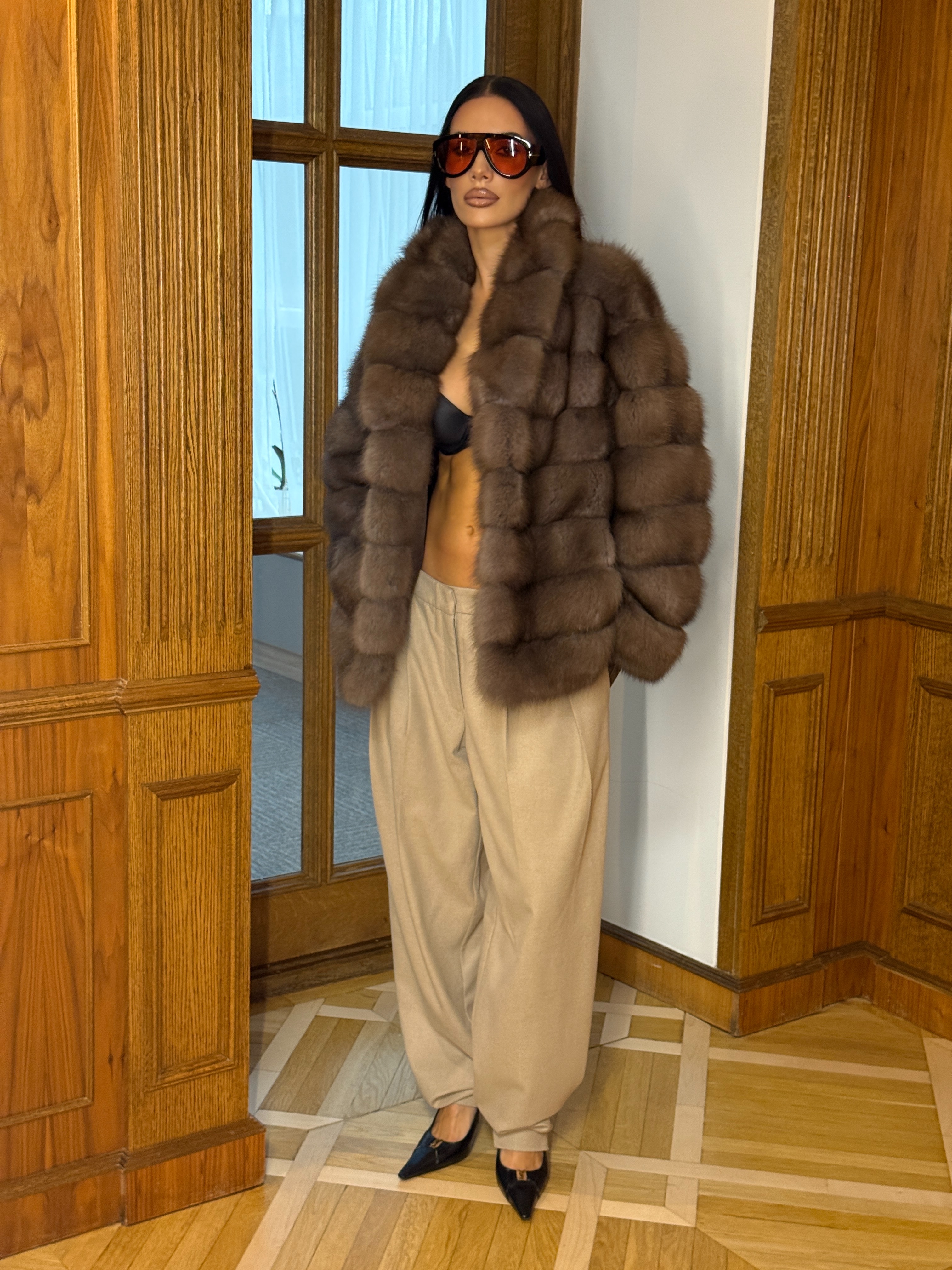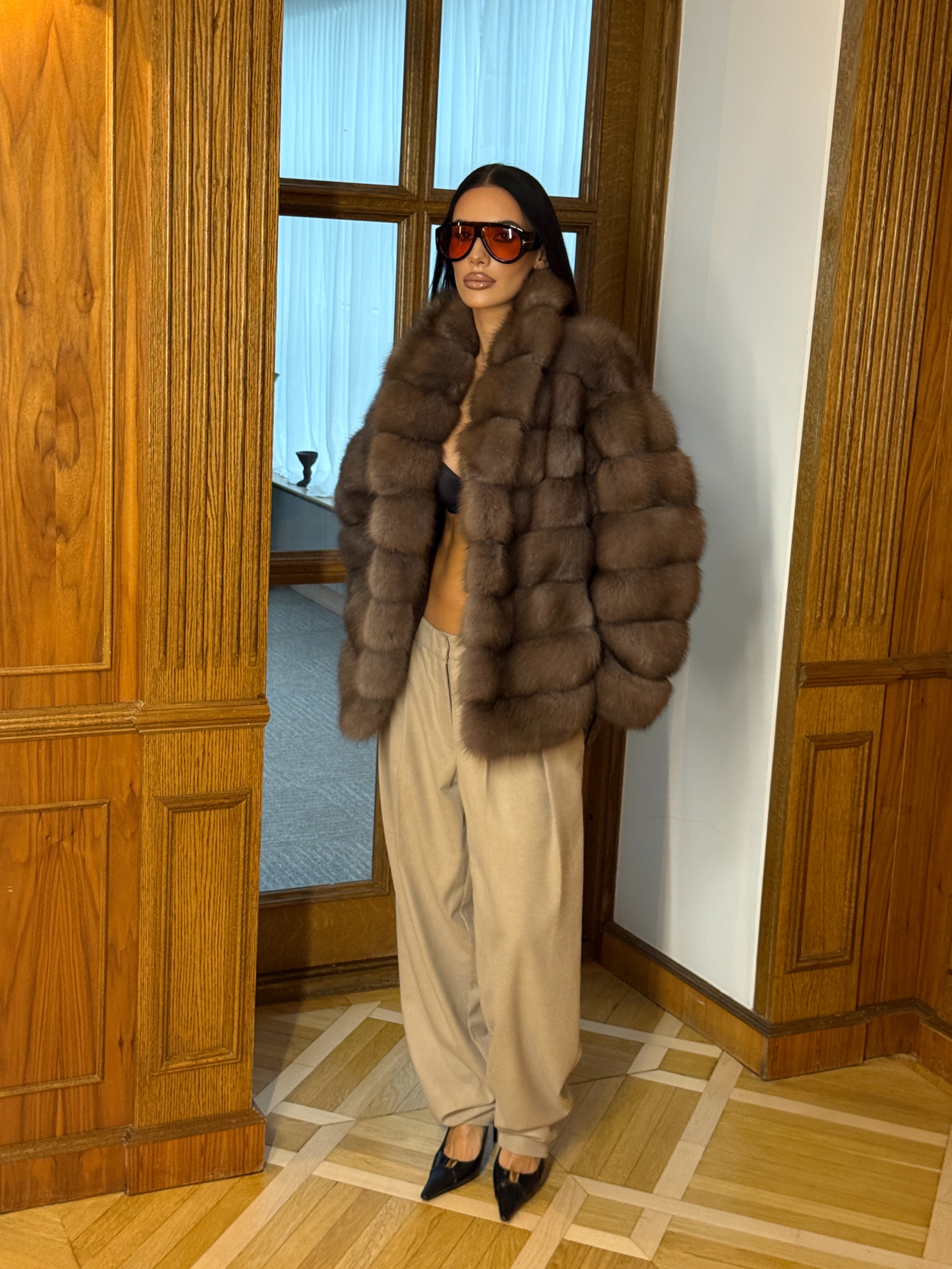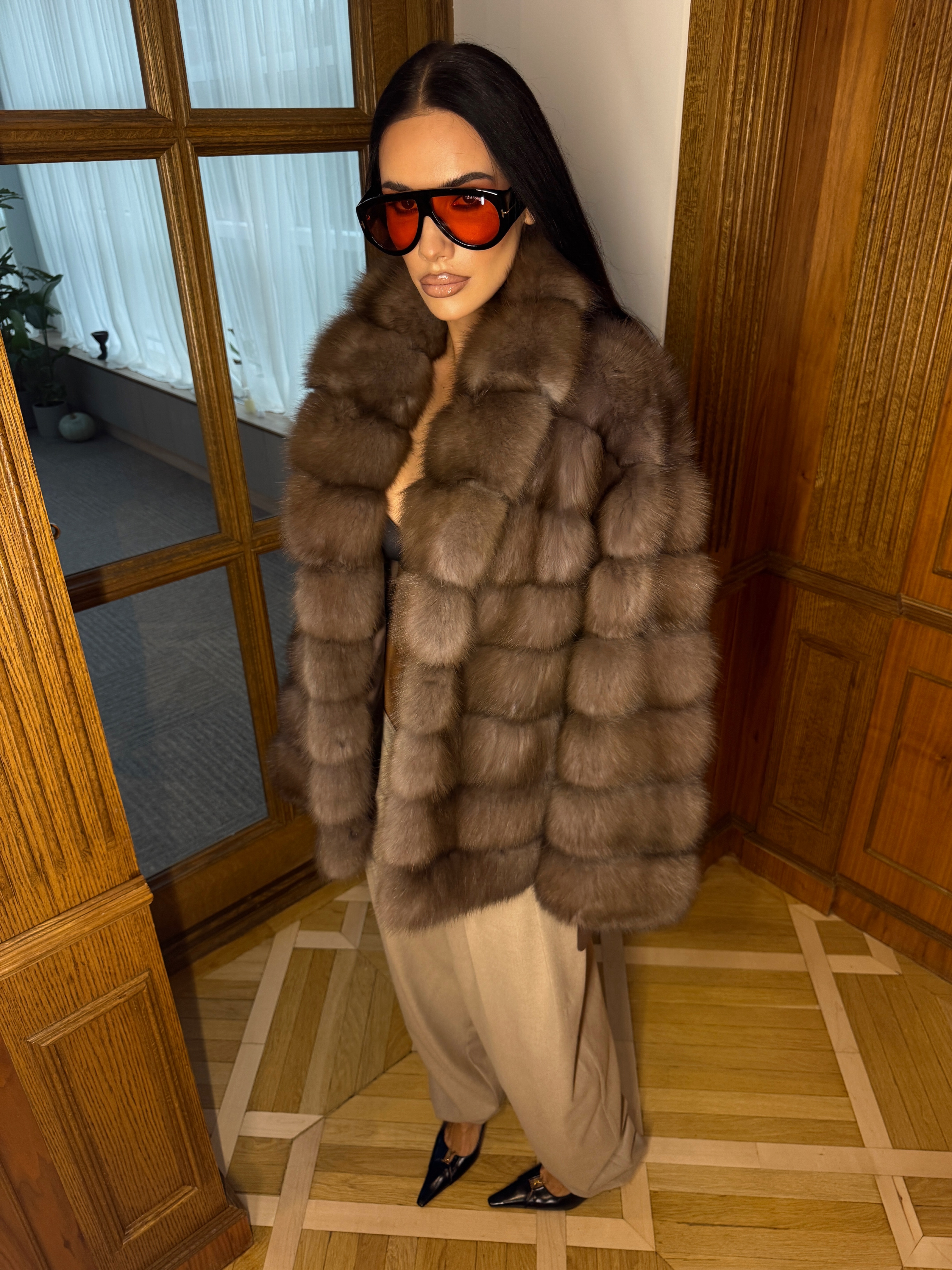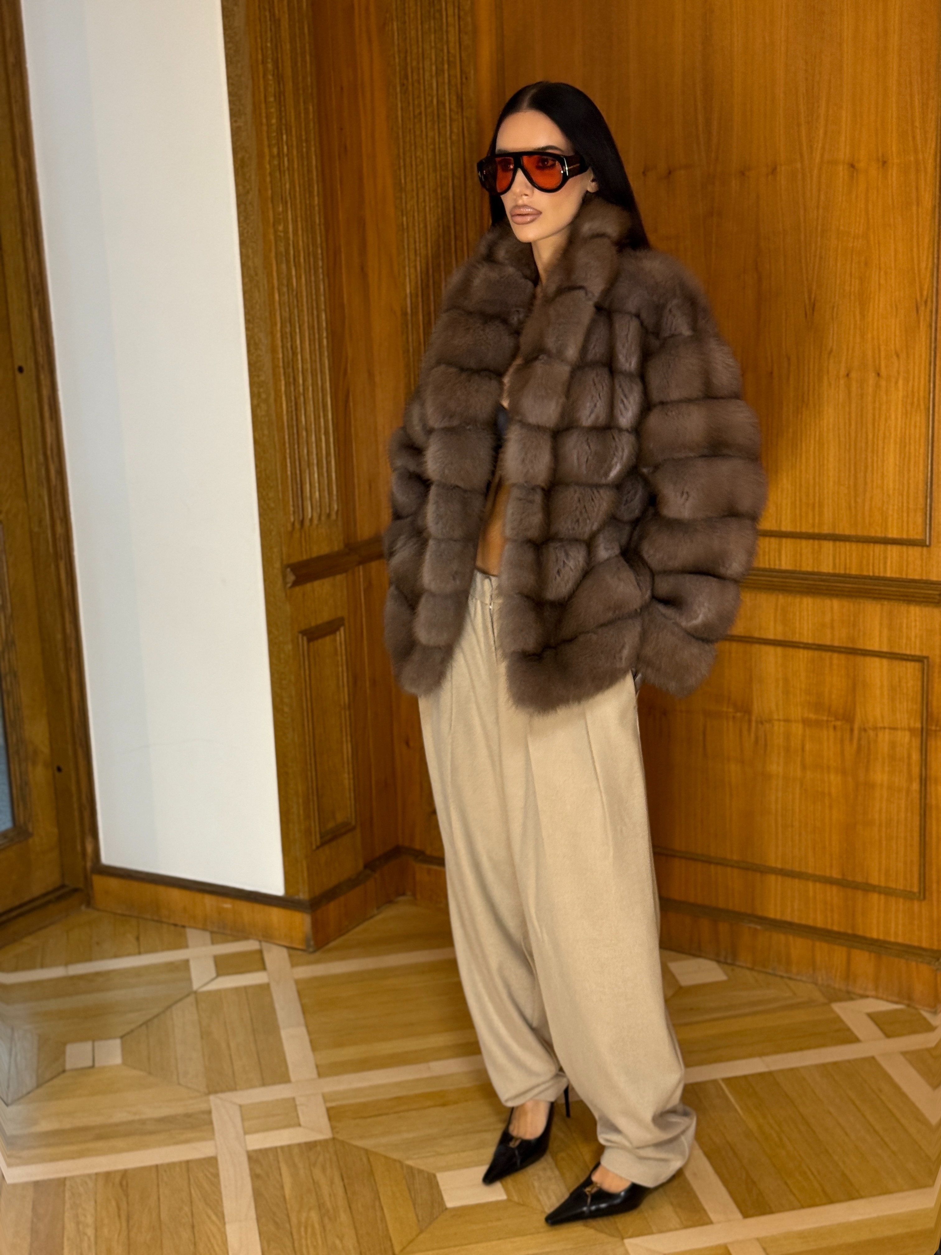Шуба из меха куницы тонировка под соболя воротник шаль